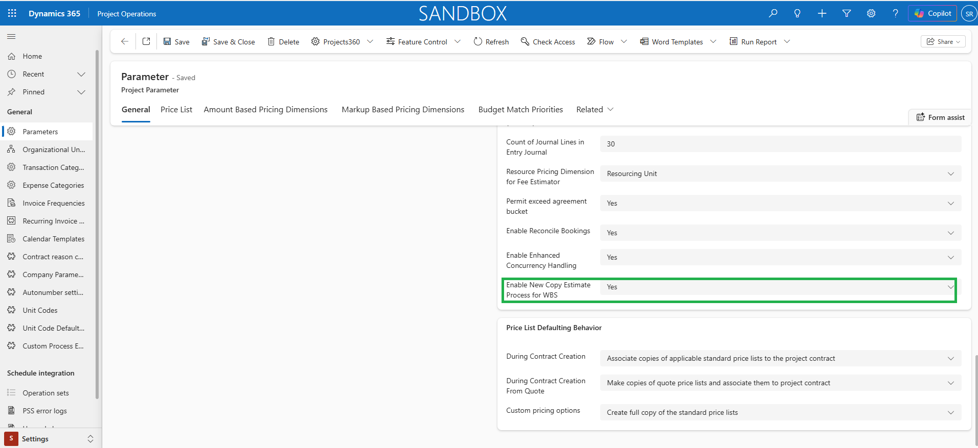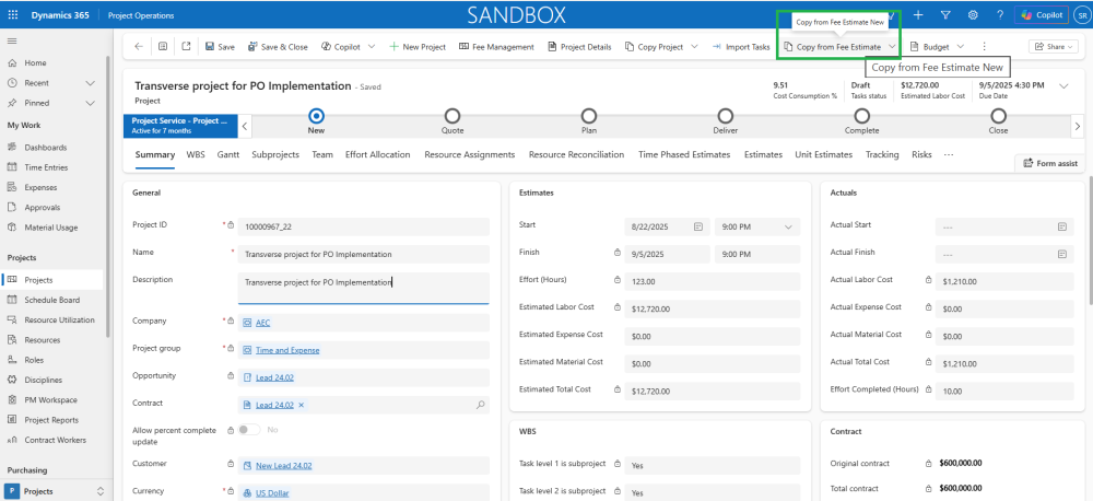 - Once the parameter is set to ‘Yes’, the ‘Copy from Fee Estimate’ button on the project is highlighted as ‘Copy from Fee Estimate New’ when the curser is hovered on the button.