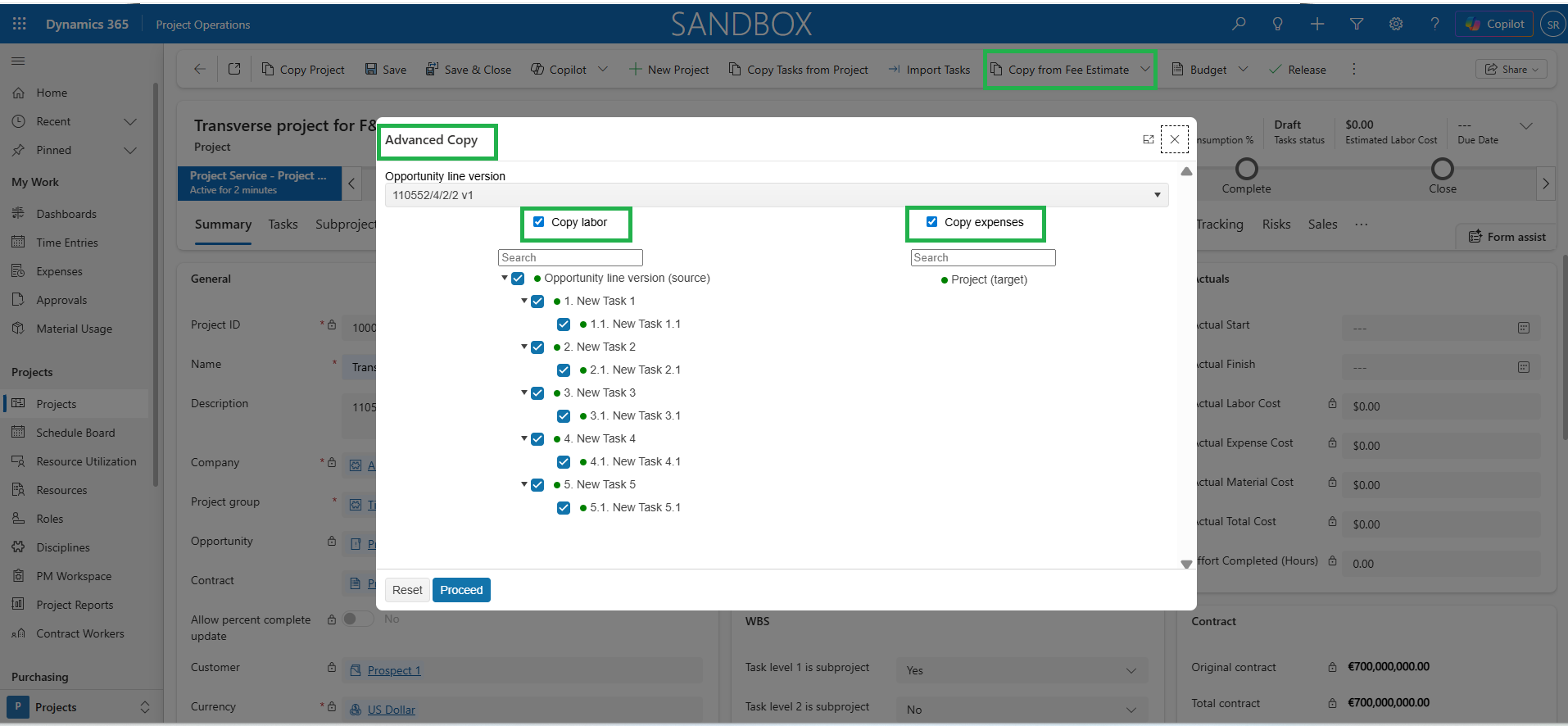 - The Advanced Copy functionality allows users to copy tasks from the fee estimate to the WBS even after the project has been released to F&O.