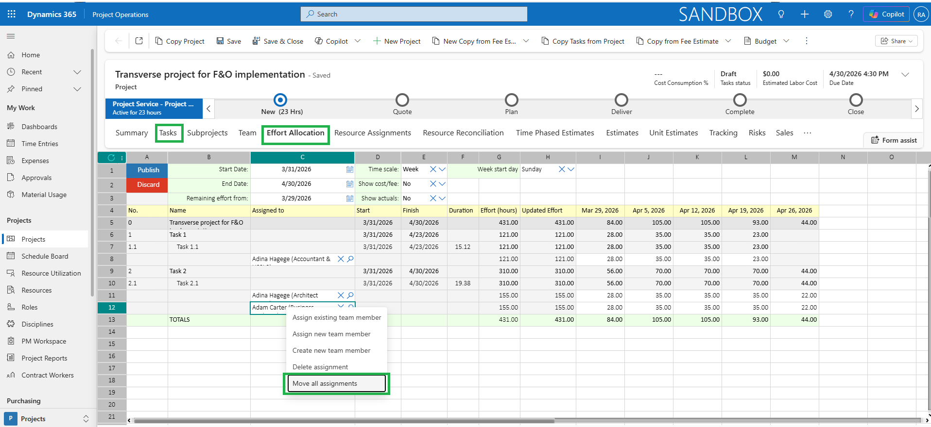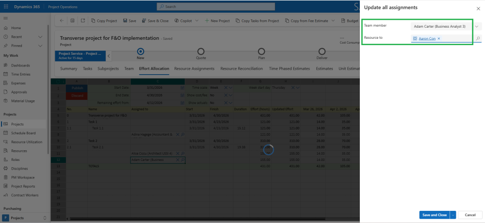 In Effort Allocation spreadsheet, all assignments from a selected resource across every task in the project can be moved to another resource in one simple action. This saves time and eliminates the need for manual updates. After the transfer, assignments are automatically published, so changes are visible right away in the project.
