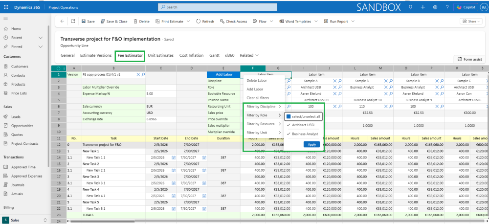 The Fee Estimator also lets users filter labor items by discipline, role, resource, and resourcing company or unit. Filtering makes it easier to compare similar labor items. It helps users quickly review effort and sales values, so they get a clearer view of the estimates and forecasts.