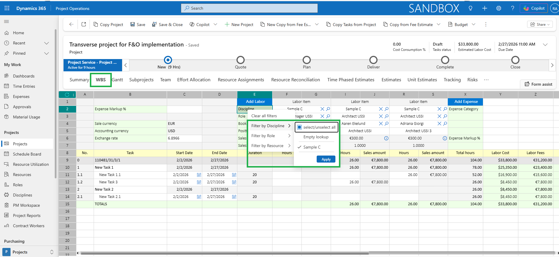 - In WBS, the labor items can be filtered by discipline, role and resources.